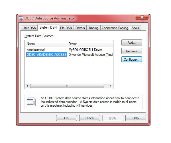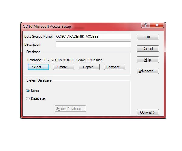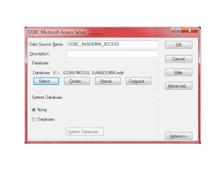 pada Data Source Name isikan “ODBC_AKADEMIK_ACCESS” dan klik tombol select untuk mencari database Access yang telah kita buat dan klik tombol OK.