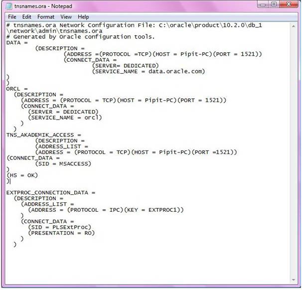 12. Pada C:/oracle/network/admin buka file tnsname.ora dan tambahkan script seperti berikut