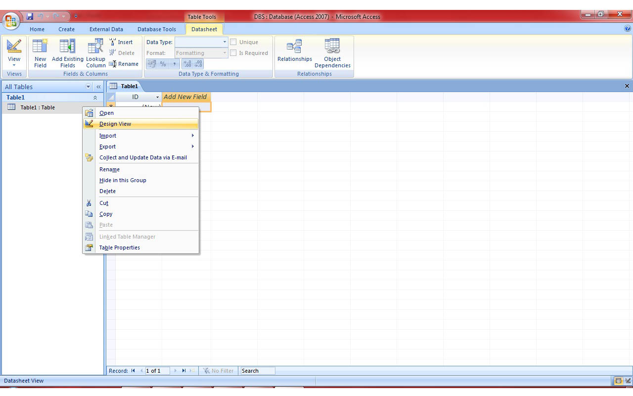 3. Selanjutnya untuk membuat table baru klik kanan pada table,kemudian pilih design view.