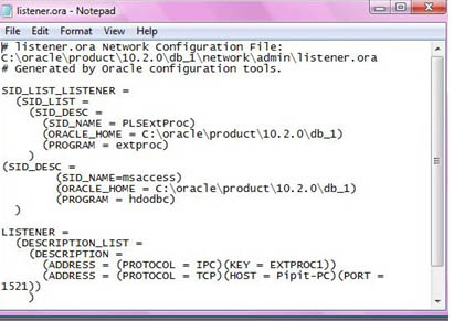 10. Pada C:/oracle/product/10.2.0/db_1/network/admin, double klik listener.ora dan ketikkan script seperti dibawah ini