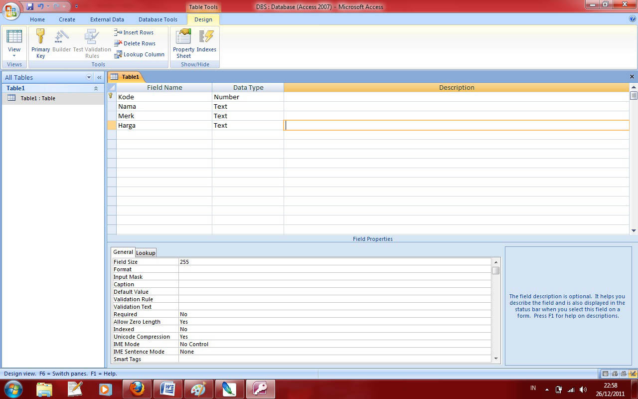view” maka akan muncul jendela design view yang digunakan untuk membuat kolom dan menentukan tipe data yang sesuai pada kolom.